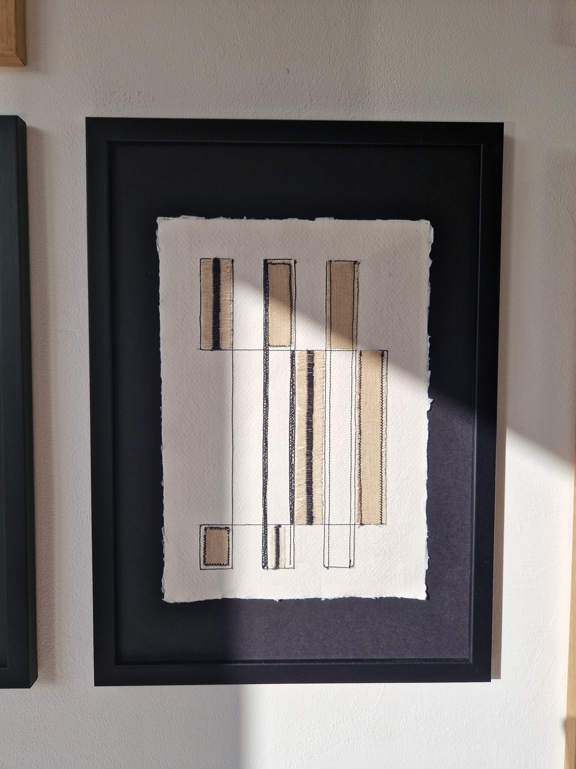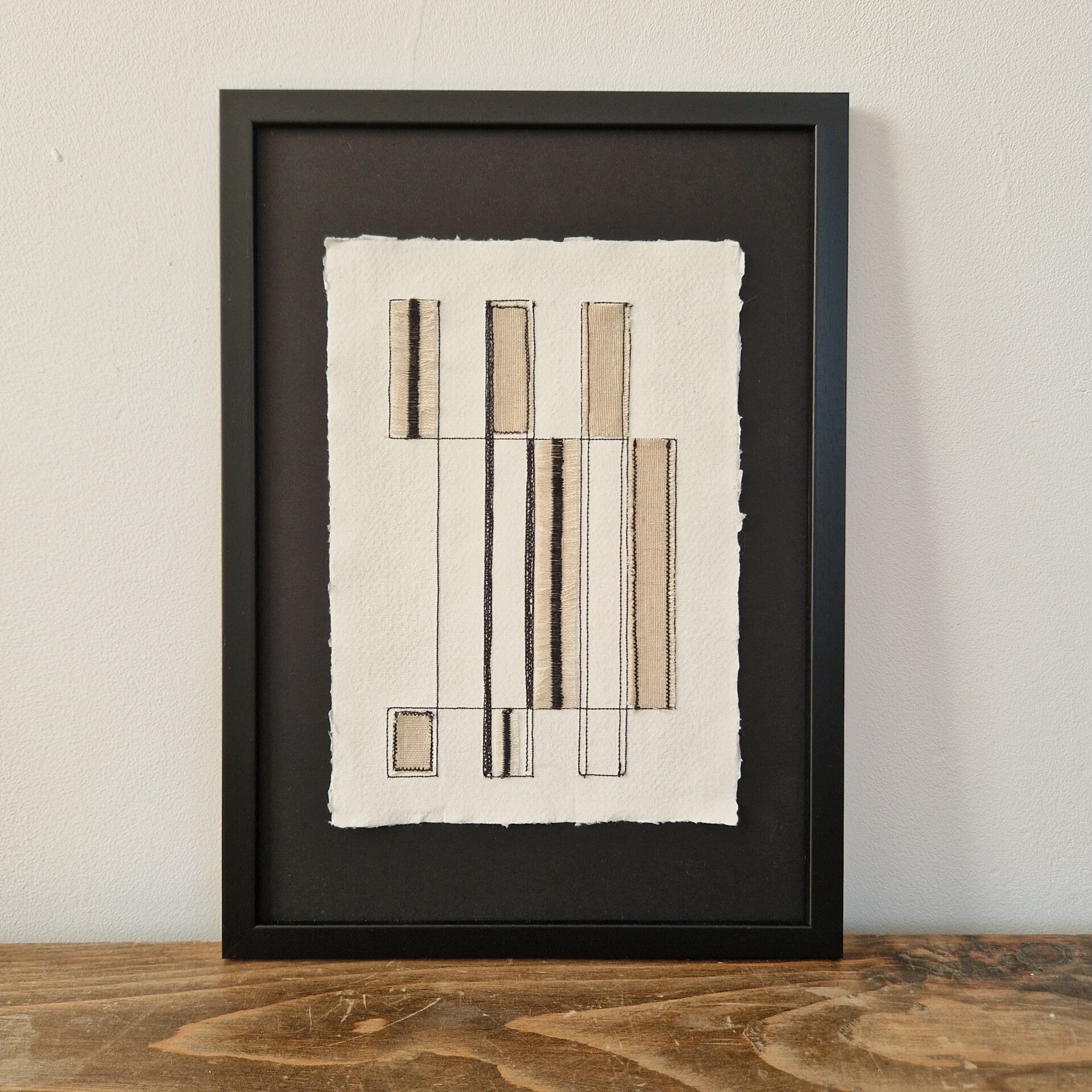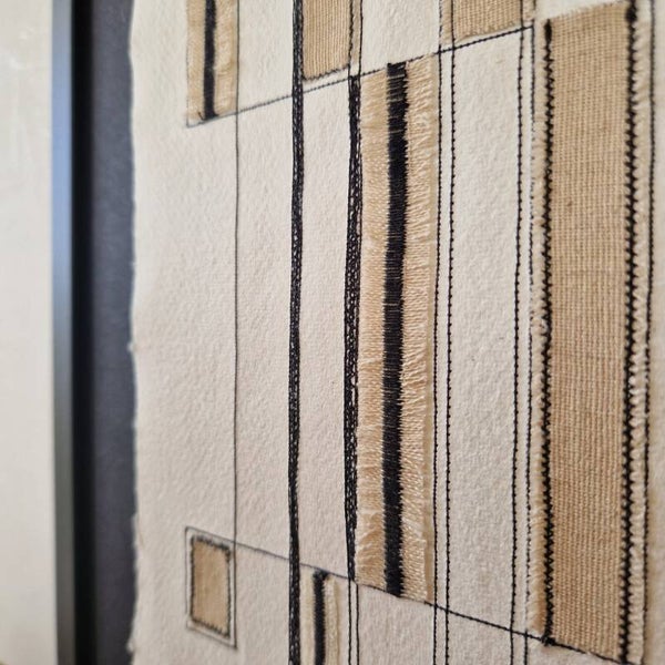 Draadkunst van linnen katoen op handgeschept papier.